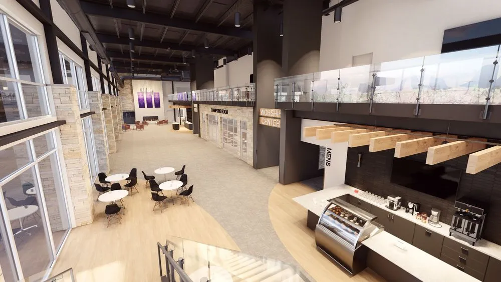 • Welcoming Lobby: An open, inviting space with a cozy coffee area and a fireplace, perfect for gathering and fellowship.